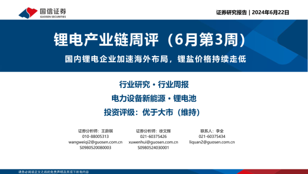 【国信证券】【20240622】锂电产业链周评(6月第3周):国内锂电企业加速海外布局,锂盐价格持续走低-18页