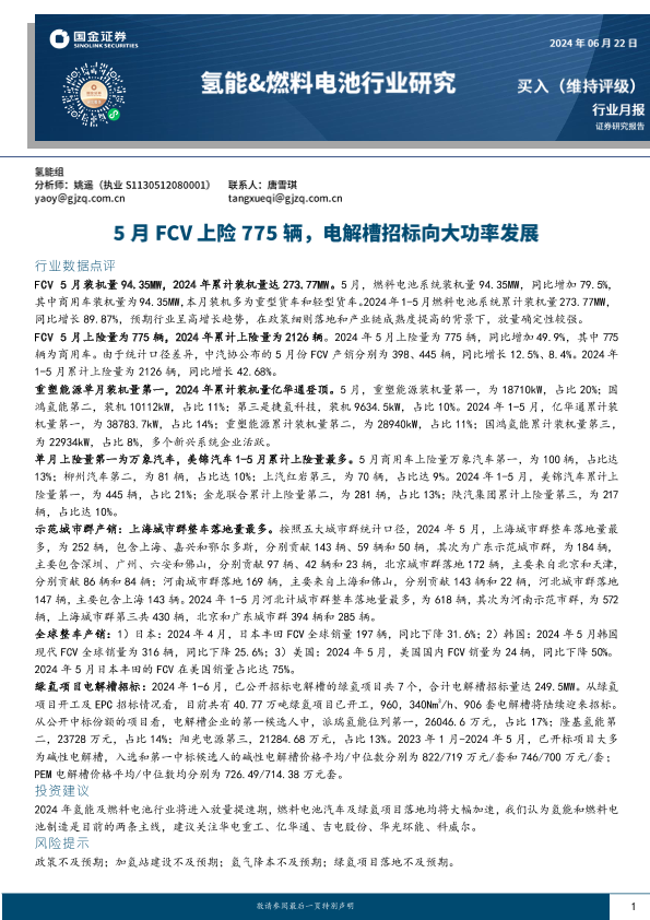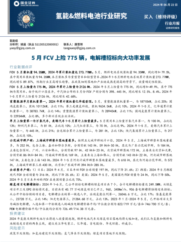 【国金证券】【20240622】20240622-国金证券-氢能&燃料电池行业研究:5月FCV上险775辆,电解槽招标向大功率发展-14页