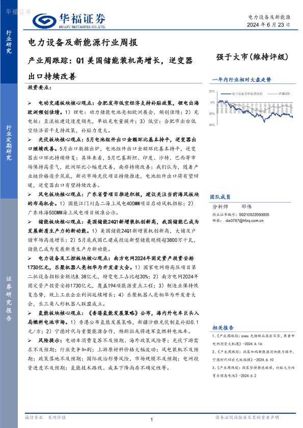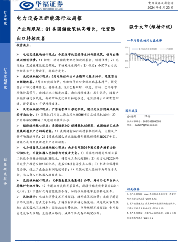 【华福证券】【20240623】电力设备及新能源行业周报:产业周跟踪:Q1美国储能装机高增长,逆变器出口持续改善-16页