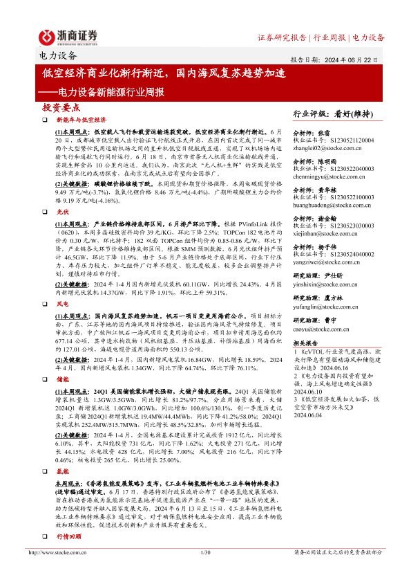 【浙商证券】【20240622】电力设备新能源行业周报:低空经济商业化渐行渐近,国内海风复苏趋势加速-30页