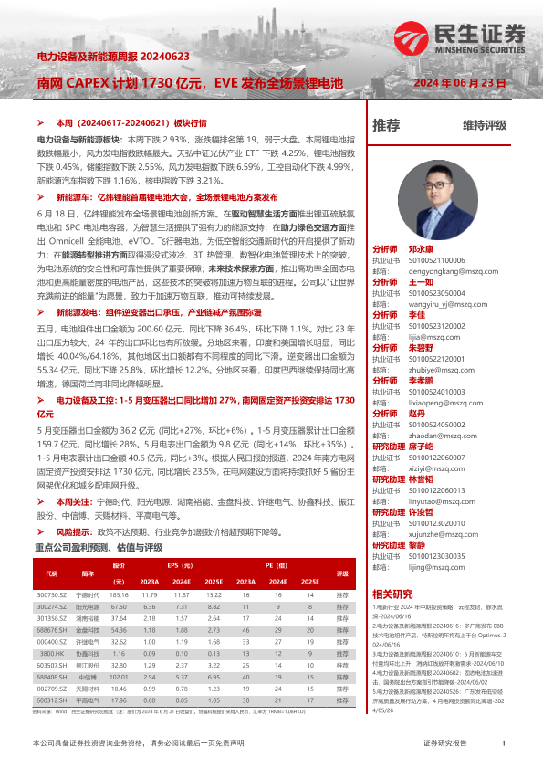 【民生证券】【20240623】电力设备及新能源周报:南网CAPEX计划1730亿元,EVE发布全场景锂电池-26页