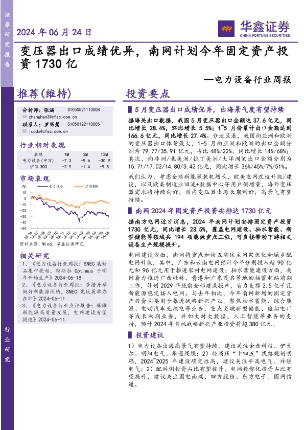 【华鑫证券】【20240624】电力设备行业周报:变压器出口成绩优异,南网计划今年固定资产投资1730亿-15页