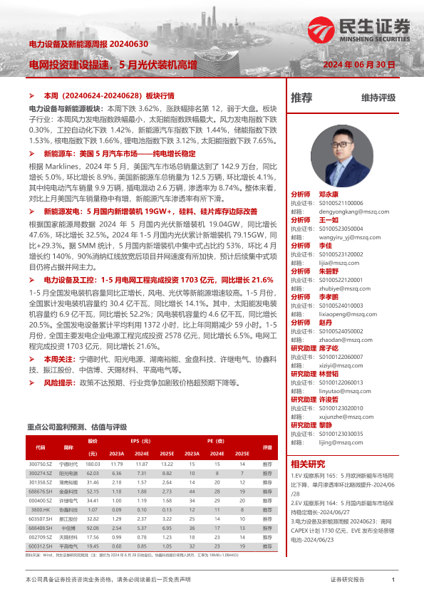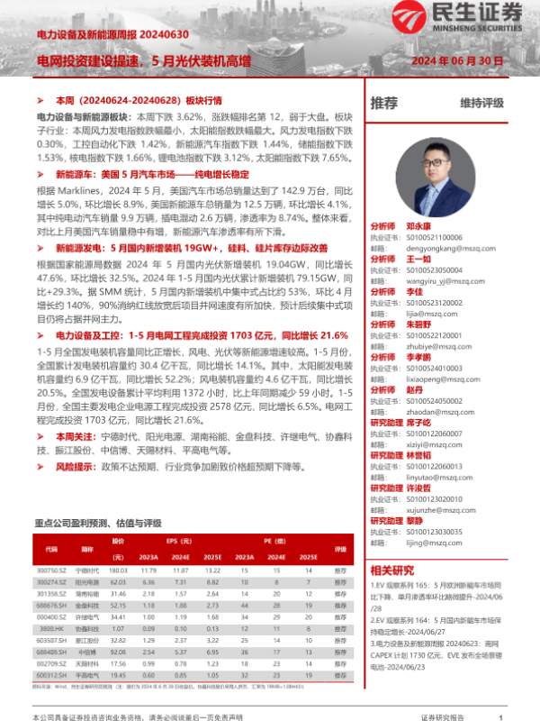 【民生证券】【20240630】电力设备及新能源周报:电网投资建设提速,5月光伏装机高增-23页