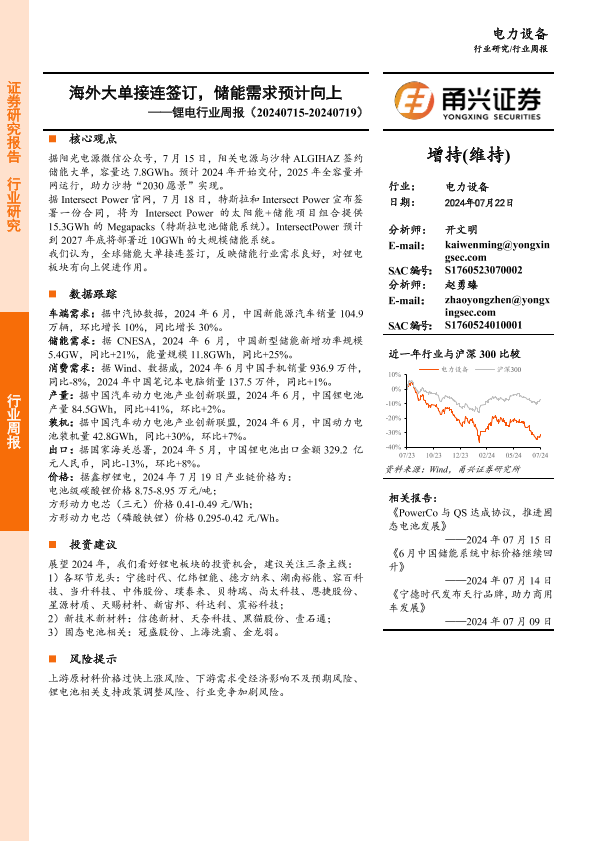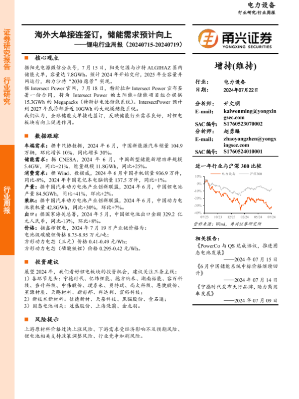 【甬兴证券】【20240722】20240722-甬兴证券-锂电行业周报:海外大单接连签订,储能需求预计向上-14页
