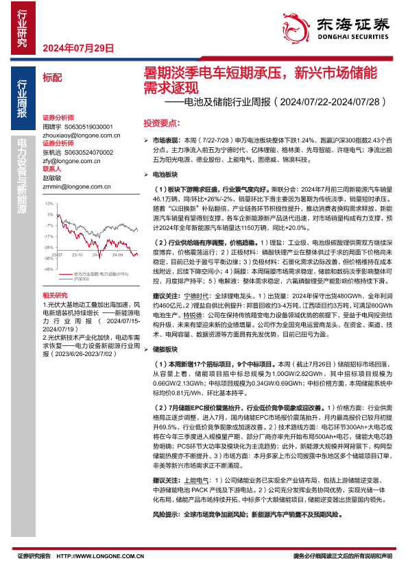 【东海证券】【20240729】电池及储能行业周报:暑期淡季电车短期承压,新兴市场储能需求逐现-12页