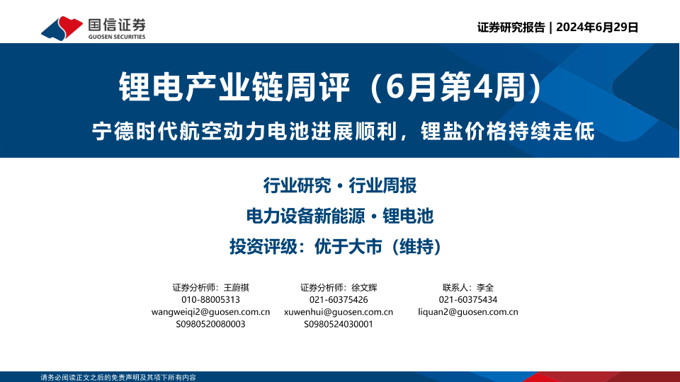 【国信证券】【20240629】锂电产业链周评(6月第4周):宁德时代航空动力电池进展顺利,锂盐价格持续走低-18页