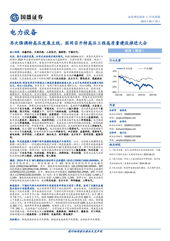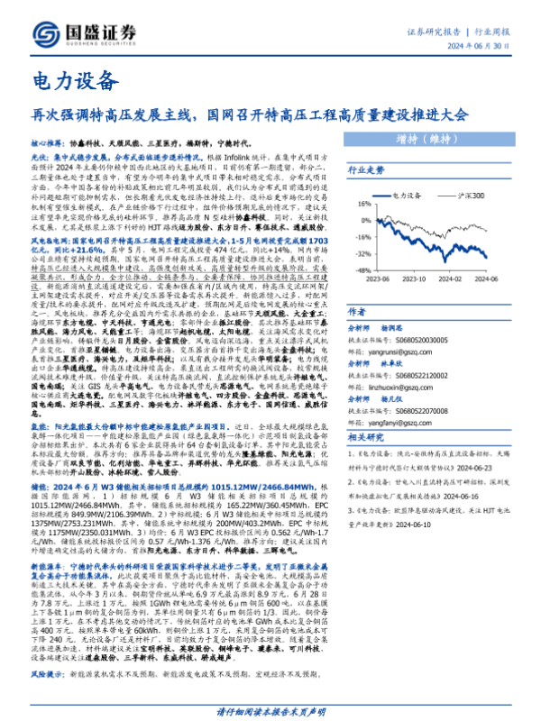 【国盛证券】【20240630】20240630-国盛证券-电力设备行业周报:再次强调特高压发展主线,国网召开特高压工程高质量建设推进大会-17页