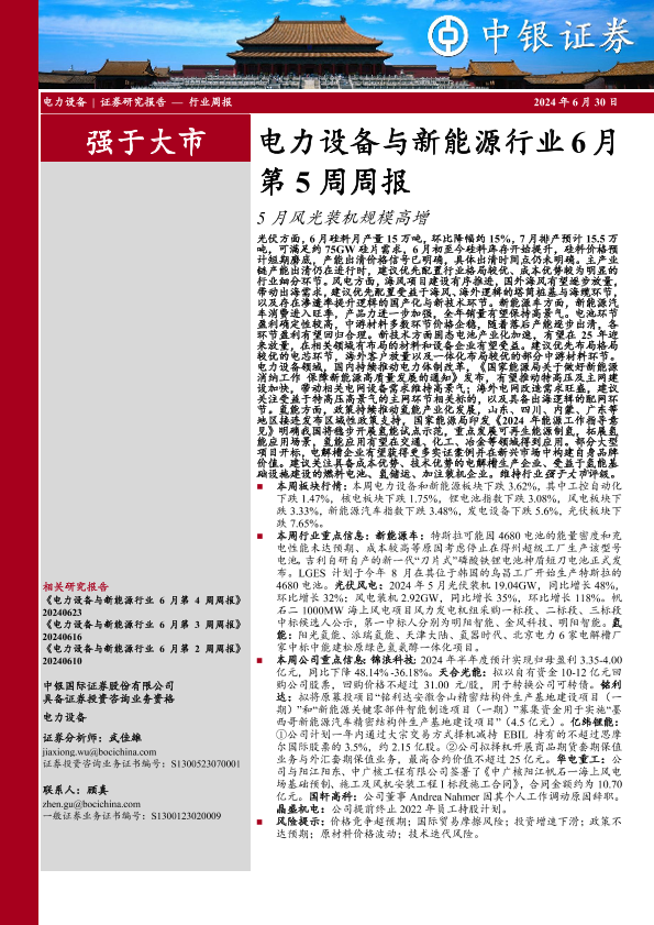 【中银证券】【20240630】电力设备与新能源行业6月第5周周报:5月风光装机规模高增-13页
