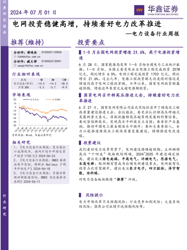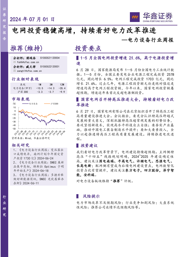 【华鑫证券】【20240701】电力设备行业周报:电网投资稳健高增,持续看好电力改革推进-18页