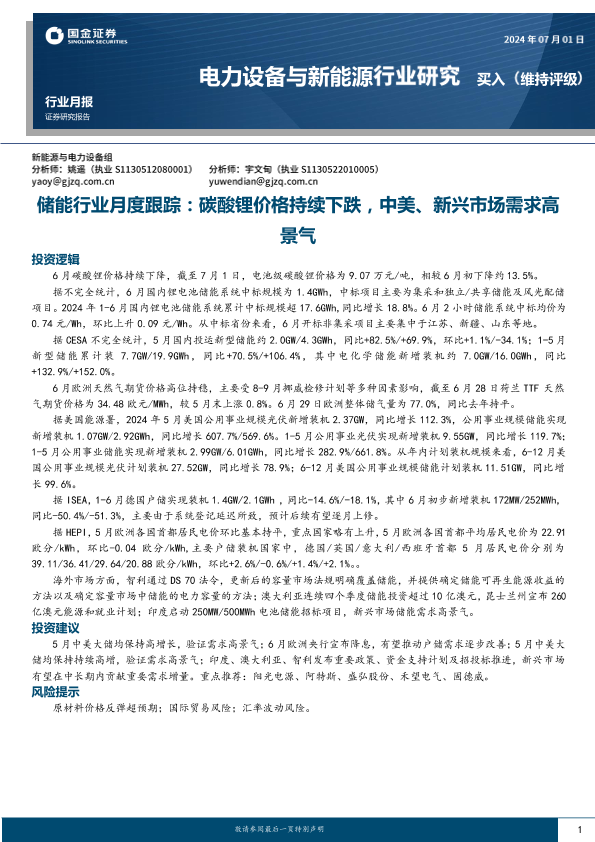 【国金证券】【20240701】储能行业月度跟踪:碳酸锂价格持续下跌,中美、新兴市场需求高景气-14页