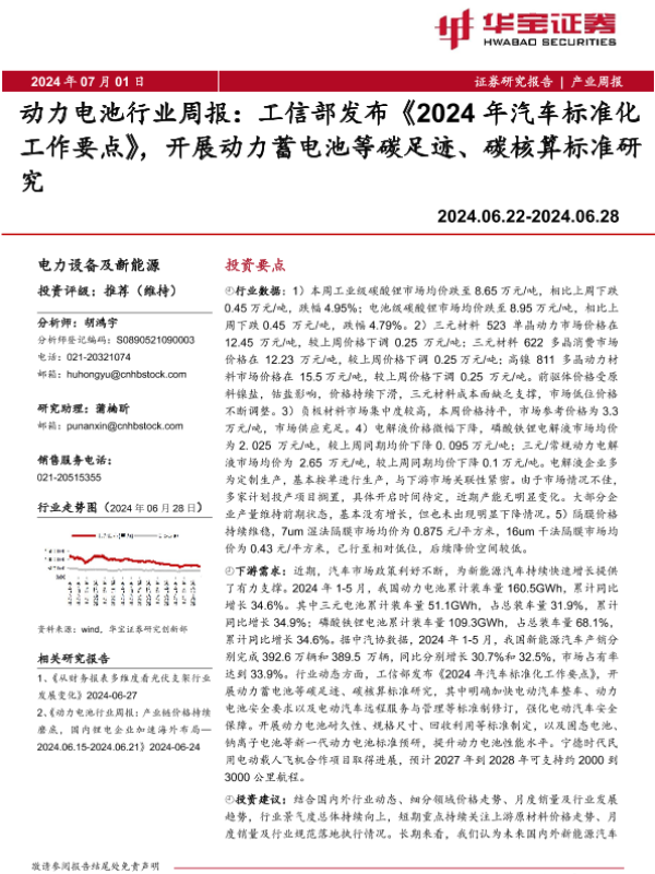 【华宝证券】【20240701】动力电池行业周报:工信部发布《2024年汽车标准化工作要点》,开展动力蓄电池等碳足迹、碳核算标准研究-18页