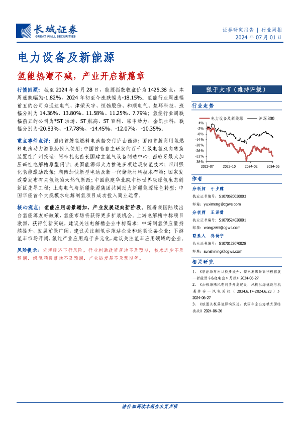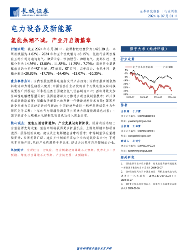 【长城证券】【20240701】电力设备及新能源行业周报:氢能热潮不减,产业开启新篇章-11页