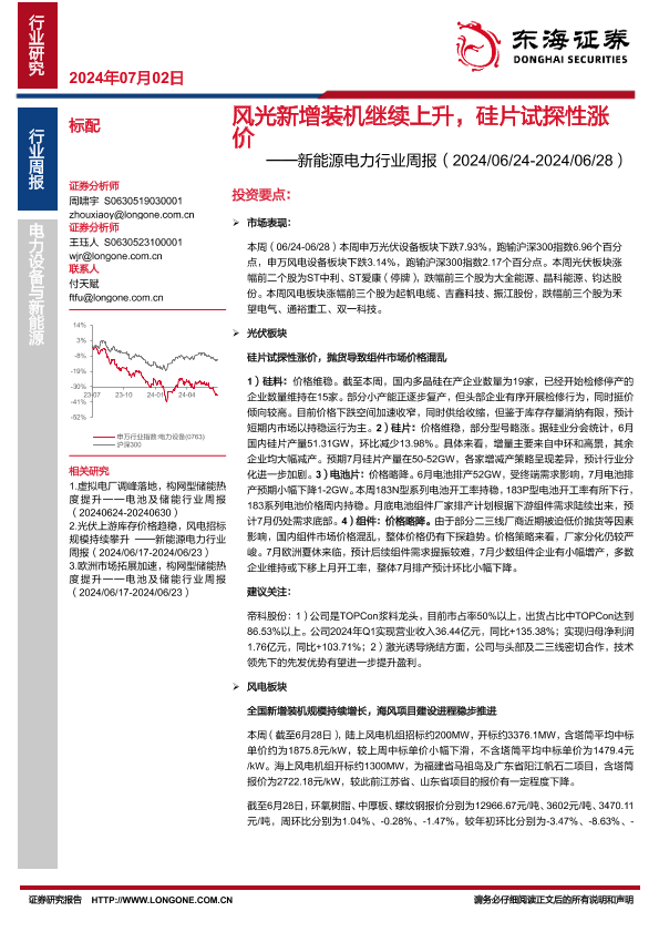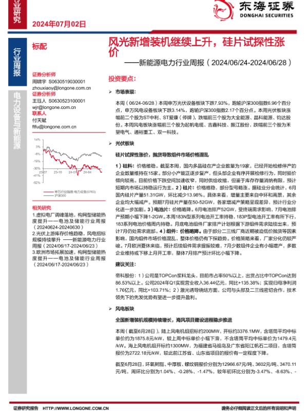 【东海证券】【20240702】风光新增装机继续上升,硅片试探性涨价-15页