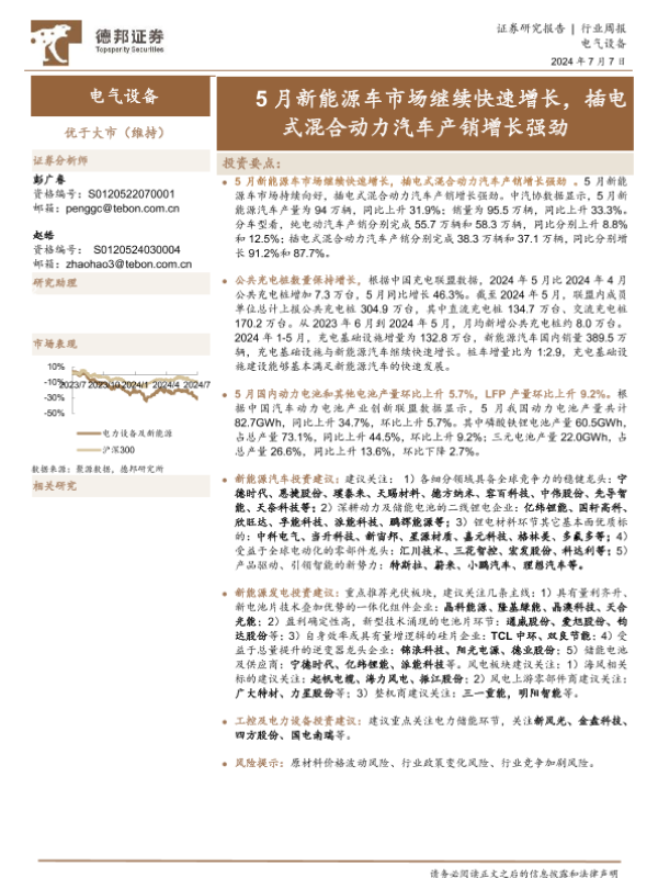 【德邦证券】【20240707】20240707-德邦证券-电气设备行业周报:5月新能源车市场继续快速增长,插电式混合动力汽车产销增长强劲-11页