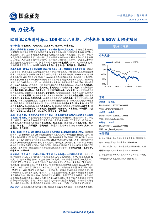 【国盛证券】【20240707】电力设备行业周报:欧盟批准法国对海风108亿欧元支持,沙特新签5.5GW太阳能项目-17页