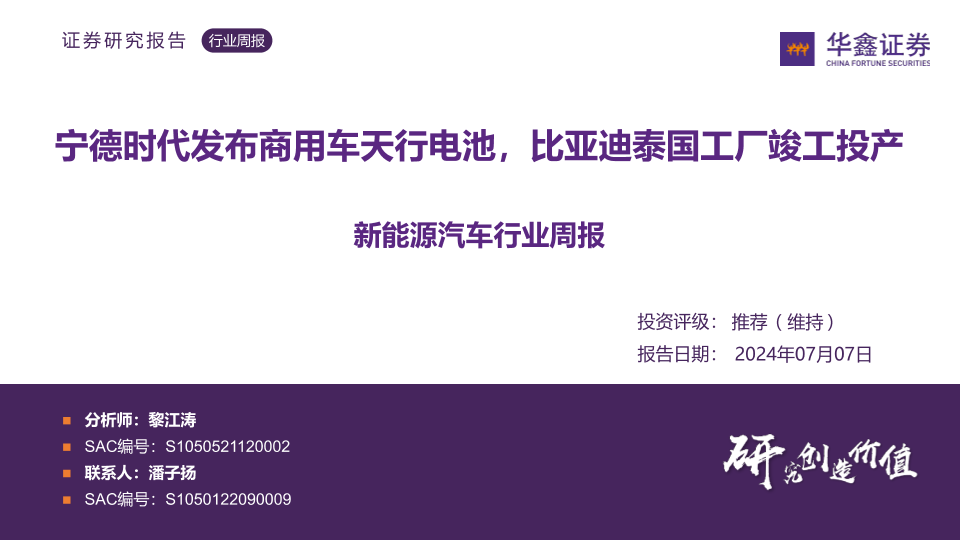【华鑫证券】【20240707】20240707-华鑫证券-新能源汽车行业周报:宁德时代发布商用车天行电池,比亚迪泰国工厂竣工投产-33页