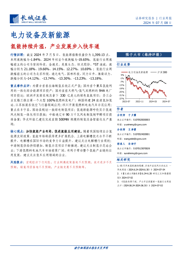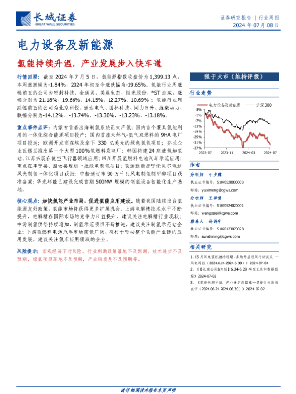 【长城证券】【20240708】电力设备及新能源行业周报:氢能持续升温,产业发展步入快车道-11页