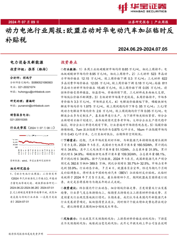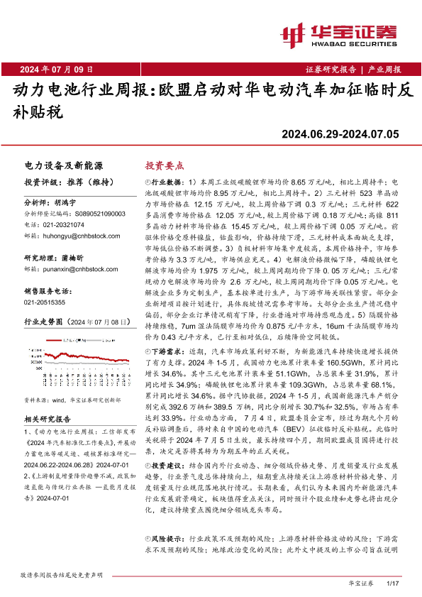 【华宝证券】【20240709】动力电池行业周报:欧盟启动对华电动汽车加征临时反补贴税-17页