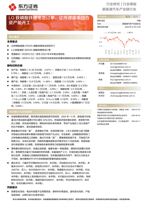 【东方证券】【20240710】新能源汽车产业链行业周报:LG获磷酸铁锂电池订单,亿纬锂能美国合资产能开工-14页