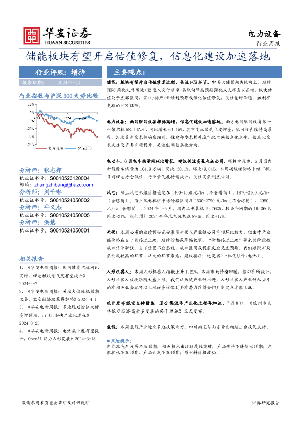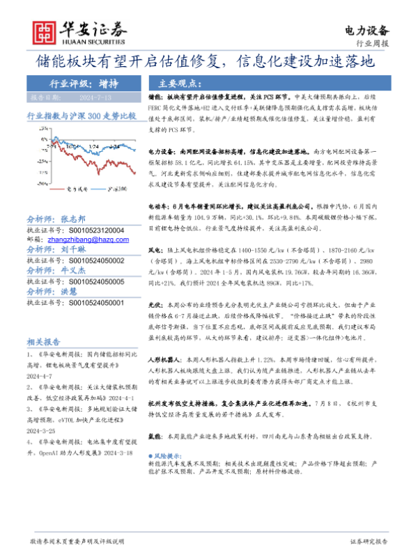 【华安证券】【20240713】20240713-华安证券-电力设备行业周报:储能板块有望开启估值修复,信息化建设加速落地-22页