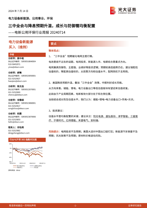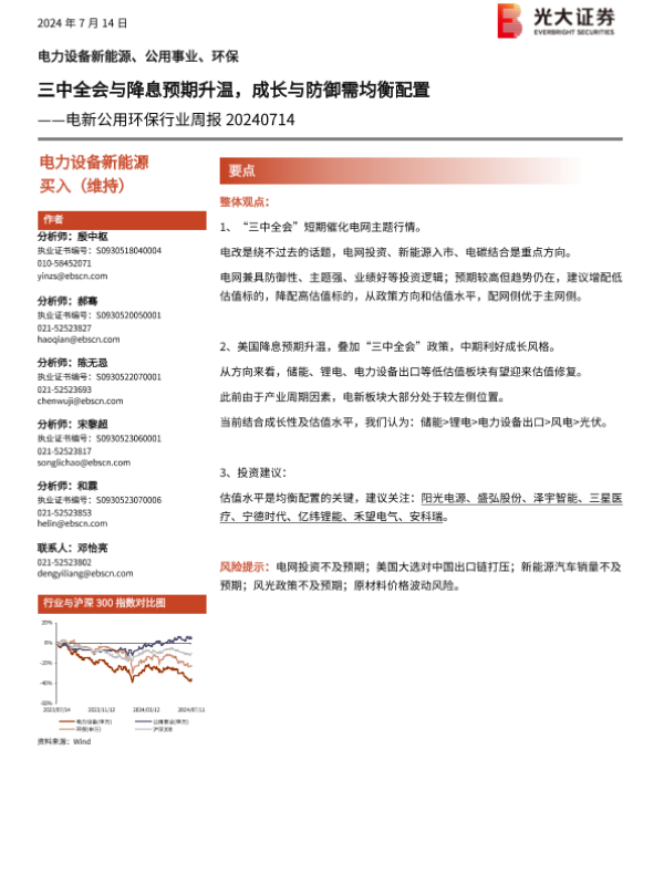 【光大证券】【20240714】电新公用环保行业周报:三中全会与降息预期升温,成长与防御需均衡配置-11页