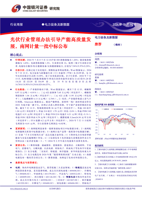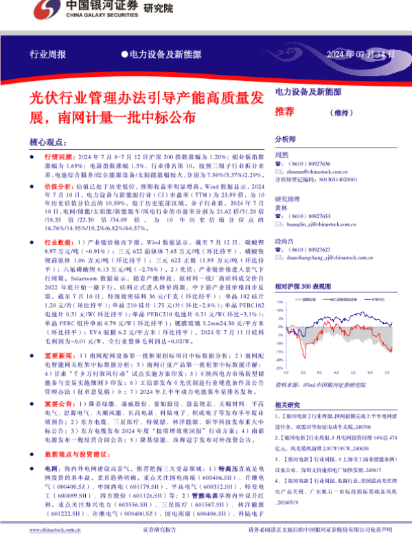 【银河证券】【20240714】电力设备及新能源行业周报:光伏行业管理办法引导产能高质量发展,南网计量一批中标公布-24页