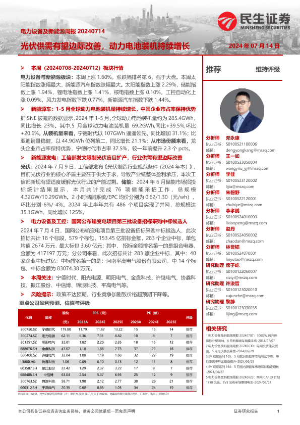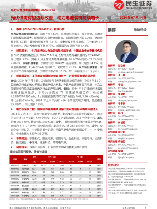 【民生证券】【20240714】电力设备及新能源周报:光伏供需有望边际改善,动力电池装机持续增长-26页