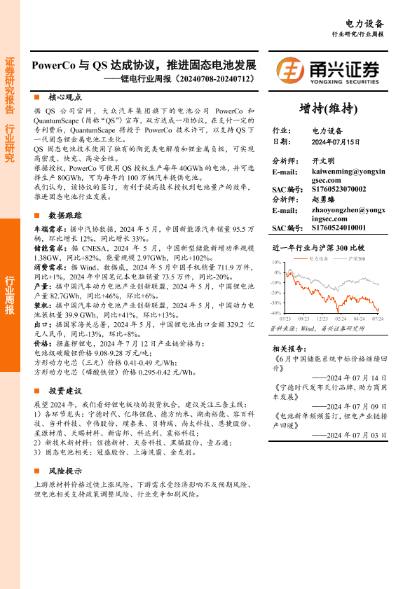 【甬兴证券】【20240715】PowerCo与QS达成协议,推进固态电池发展-15页