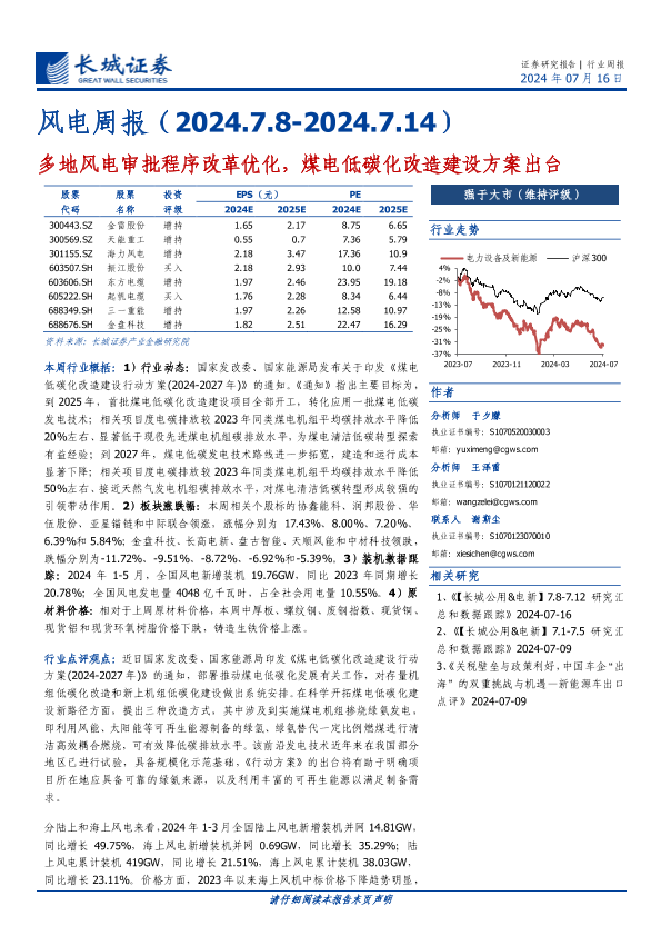 【长城证券】【20240716】风电周报:多地风电审批程序改革优化,煤电低碳化改造建设方案出台-15页