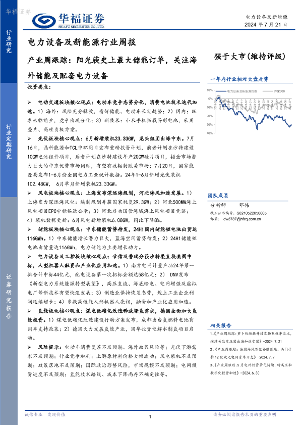【华福证券】【20240721】电力设备及新能源行业周报:产业周跟踪:阳光获史上最大储能订单,关注海外储能及配套电力设备-17页
