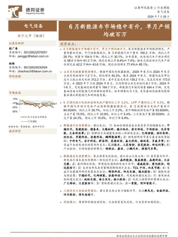 【德邦证券】【20240728】20240728-德邦证券-电气设备行业周报:6月新能源车市场稳中有升,单月产销均破百万-11页