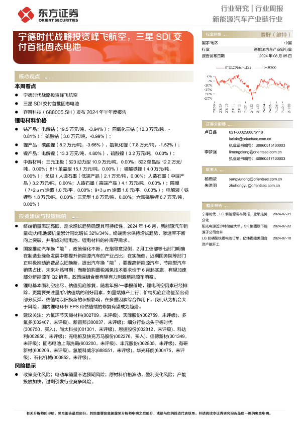 【东方证券】【20240805】20240805-东方证券-新能源汽车产业链行业周报:宁德时代战略投资峰飞航空,三星SDI交付首批固态电池-13页