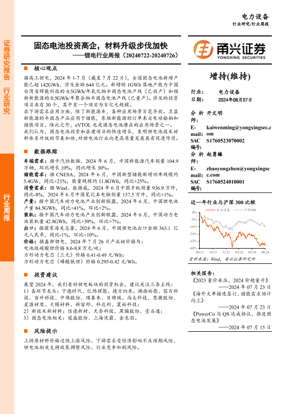 【甬兴证券】【20240807】20240807-甬兴证券-锂电行业周报:固态电池投资高企,材料升级步伐加快-15页