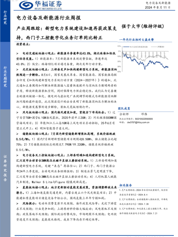 【华福证券】【20240811】电力设备及新能源行业周报:产业周跟踪,新型电力系统建设加速再获政策支持,西门子工控数字化业务订单同比转正-18页