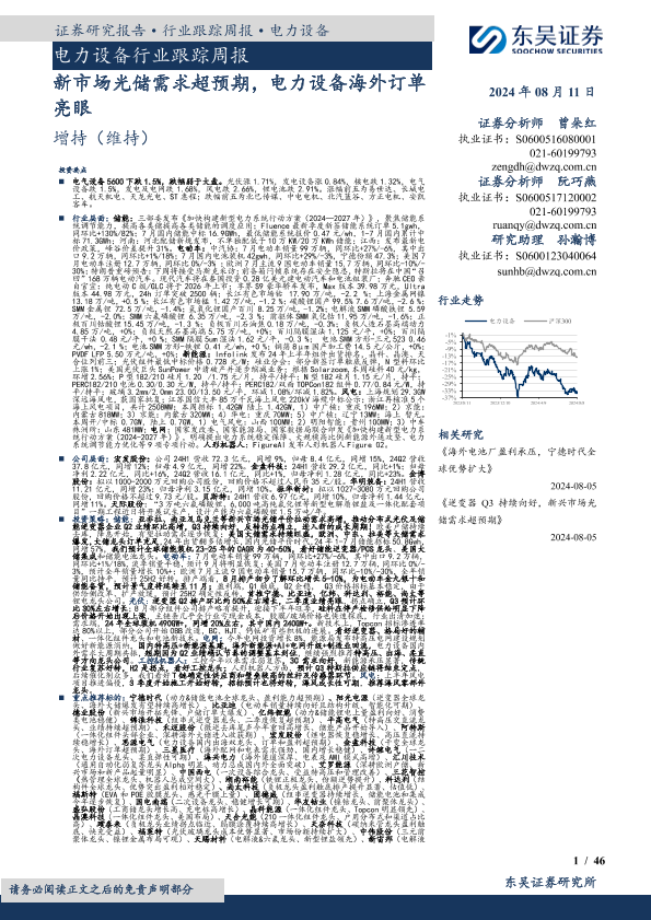 【东吴证券】【20240811】电力设备行业跟踪周报:新市场光储需求超预期,电力设备海外订单亮眼-46页
