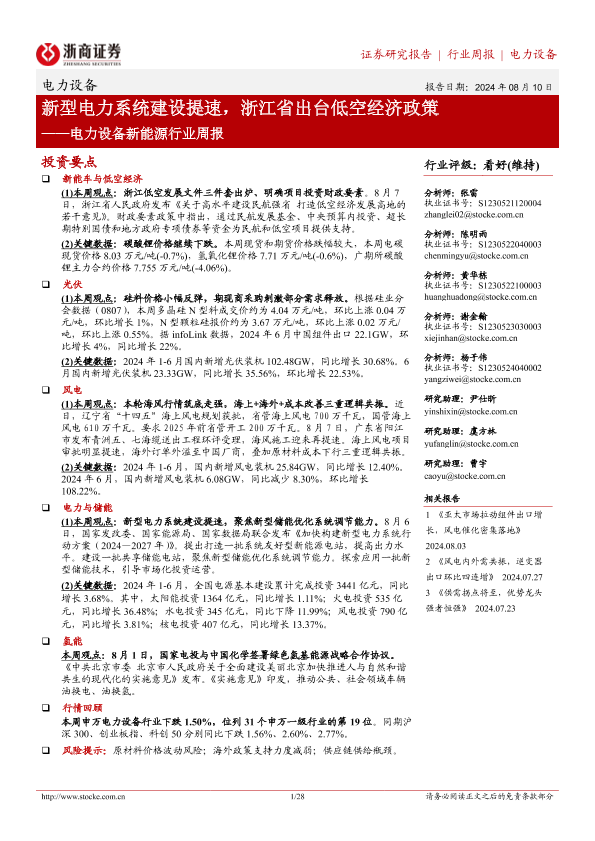 【浙商证券】【20240810】电力设备新能源行业周报:新型电力系统建设提速,浙江省出台低空经济政策-28页