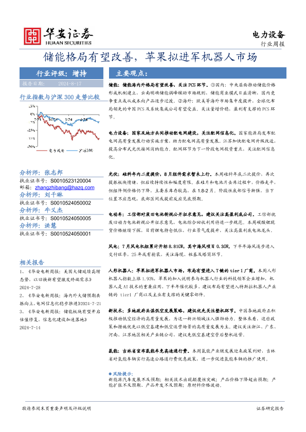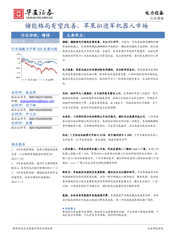 【华安证券】【20240817】20240817-华安证券-电力设备行业周报:储能格局有望改善,苹果拟进军机器人市场-22页