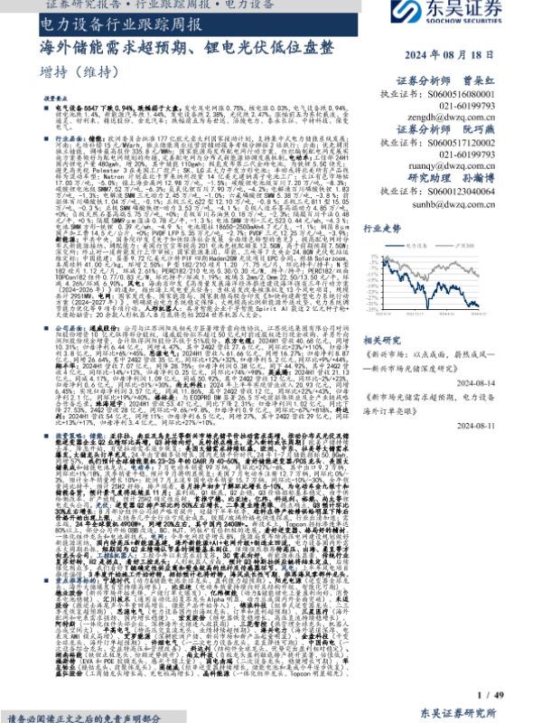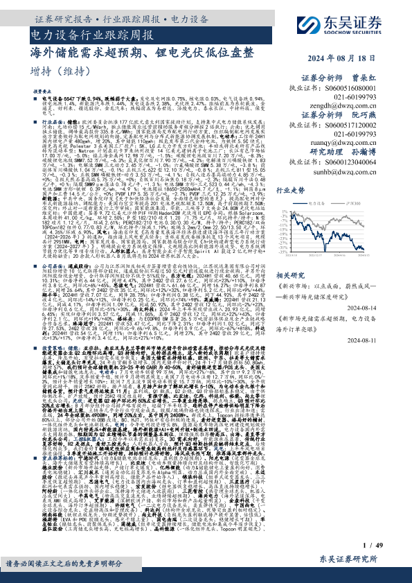 【东吴证券】【20240818】电力设备行业跟踪周报:海外储能需求超预期、锂电光伏低位盘整-49页