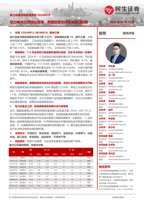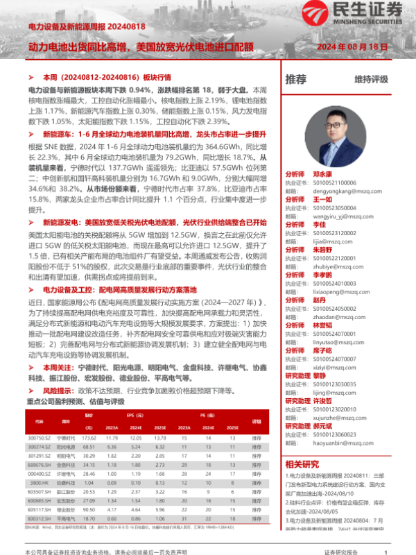【民生证券】【20240818】电力设备及新能源周报:动力电池出货同比高增,美国放宽光伏电池进口配额-23页