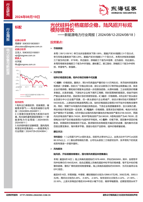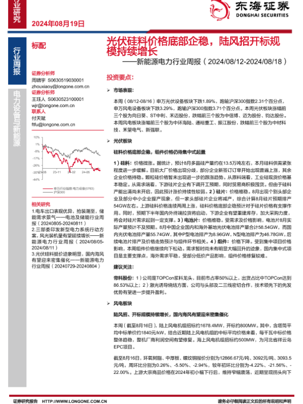 【东海证券】【20240819】20240819-东海证券-新能源电力行业周报:光伏硅料价格底部企稳,陆风招开标规模持续增长-16页