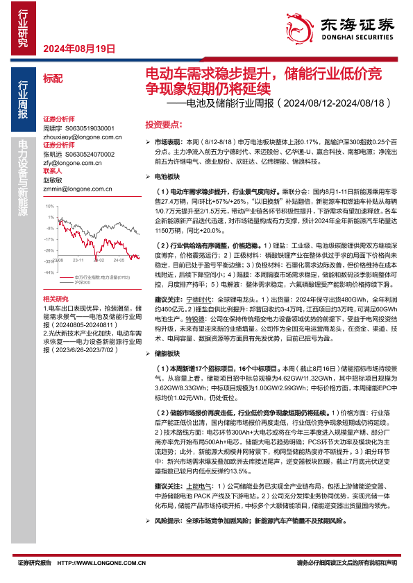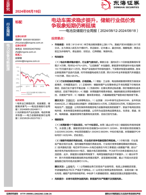【东海证券】【20240819】20240819-东海证券-电池及储能行业周报:电动车需求稳步提升,储能行业低价竞争现象短期仍将延续-12页