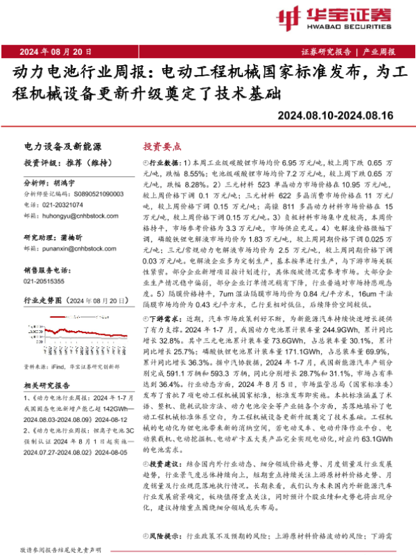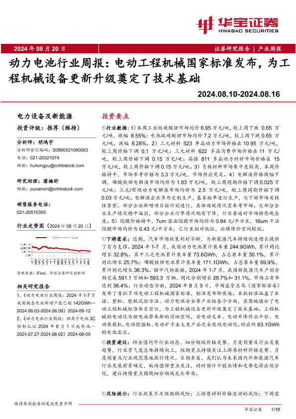 【华宝证券】【20240820】动力电池行业周报:电动工程机械国家标准发布,为工程机械设备更新升级奠定了技术基础-18页