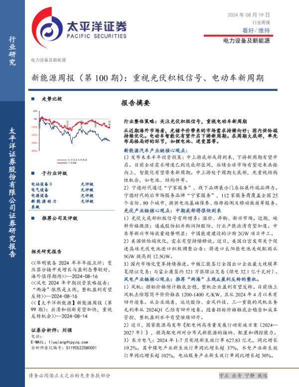 【太平洋证券】【20240819】20240819-太平洋-新能源行业周报(第100期):重视光伏积极信号、电动车新周期-36页