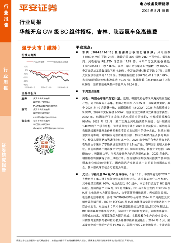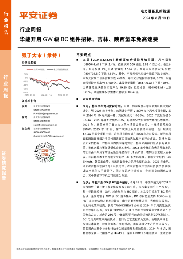 【平安证券】【20240819】电力设备及新能源行业周报:华能开启GW级BC组件招标,吉林、陕西氢车免高速费-22页