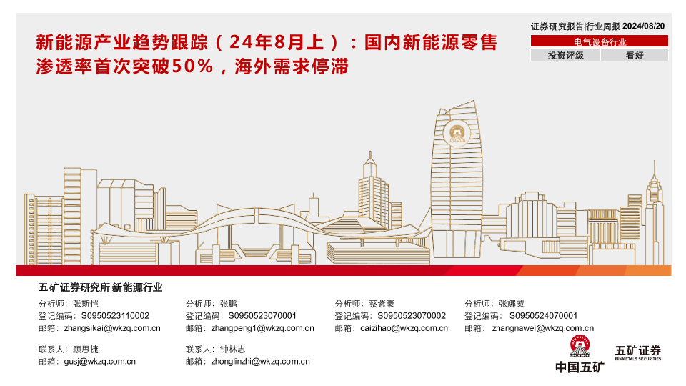 【五矿证券】【20240820】20240820-五矿证券-新能源产业趋势跟踪(24年8月上):国内新能源零售渗透率首次突破50%,海外需求停滞-45页