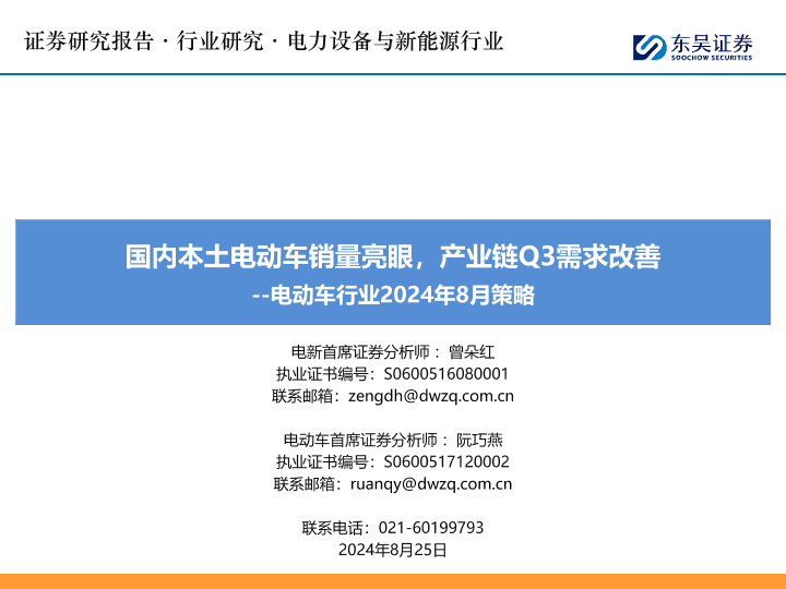 【东吴证券】【20240825】国内本土电动车销量亮眼,产业链Q3需求改善-66页