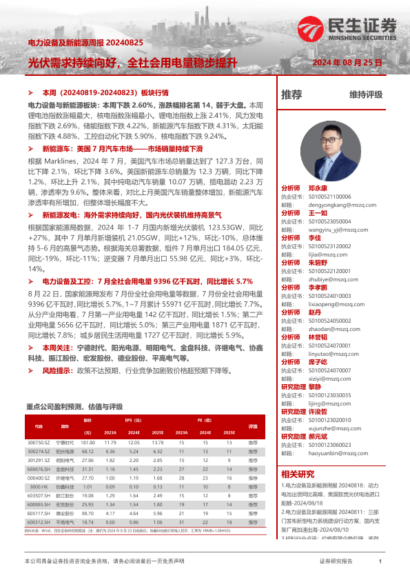 【民生证券】【20240825】电力设备及新能源周报:光伏需求持续向好,全社会用电量稳步提升-25页