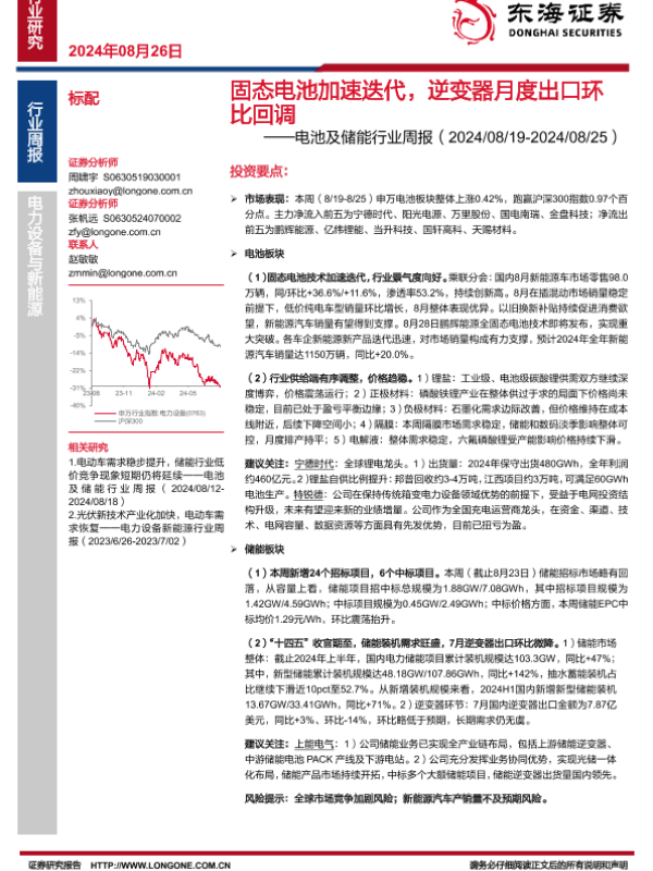 【东海证券】【20240826】20240826-东海证券-电池及储能行业周报:固态电池加速迭代,逆变器月度出口环比回调-12页