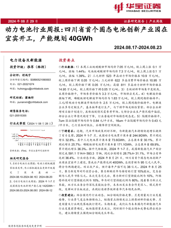 【华宝证券】【20240829】动力电池行业周报:四川省首个固态电池创新产业园在宜宾开工,产能规划40GWh-18页