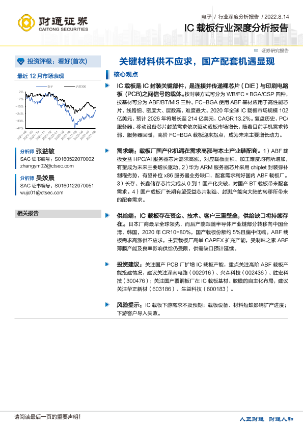 【财通证券】【20220814】电子行业IC载板深度分析报告:关键材料供不应求,国产配套机遇显现-30页